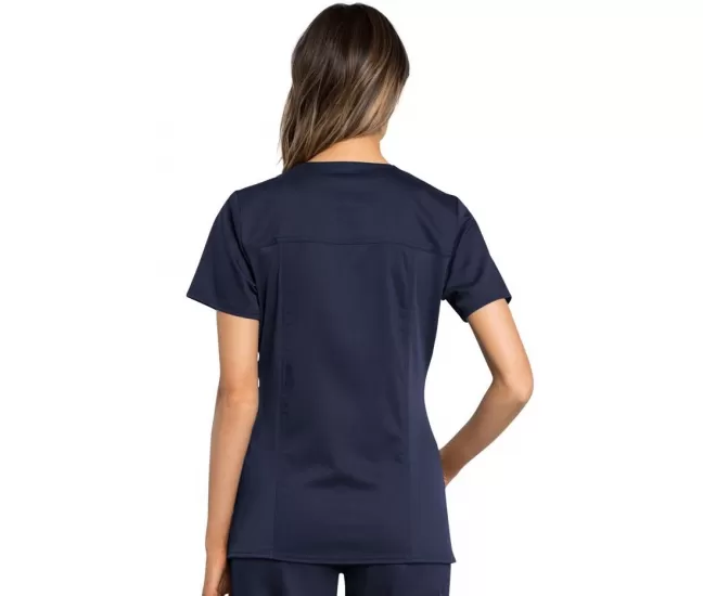 Cherokee WWE775AB women's scrub top, NavyCherokee WWE775AB women's scrub top is made from 78% polyester, 20% rayon, and 2% spandex stretch coat fabric, with a crossover V-neckline, chest princess seaming for a sleek fit, rib knit back panels, and side vents.