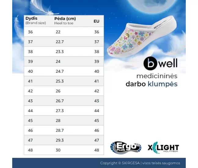 Padas neslysta iš poliuretano, o vidpadis su energijos sugėrikliu kulno srityje. Medicininės darbo klumpės pasižymi puikiu lankstumu, yra modernaus dizaino, baltos spalvos, lengvos ir patogios viso darbo proceso metu.