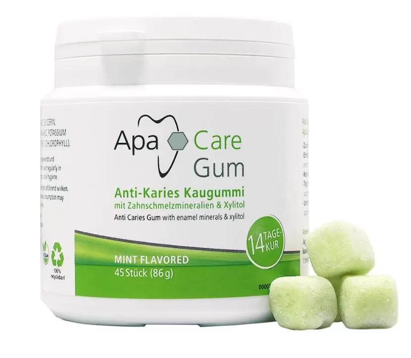 The sugar-free ApaCare anti-caries chewing gums contain xylitol, a tasty, naturally occurring sugar substitute (also called birch sugar), which helps reduce cavity-causing bacteria in the oral cavity. Together with the tooth enamel minerals calcium contained in ApaCare anti-caries chewing gum, the remineralization and repair of damaged tooth enamel is sustainably promoted.