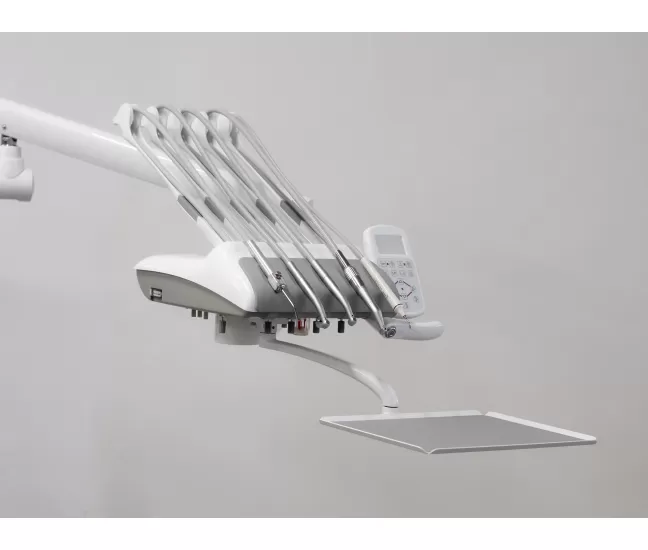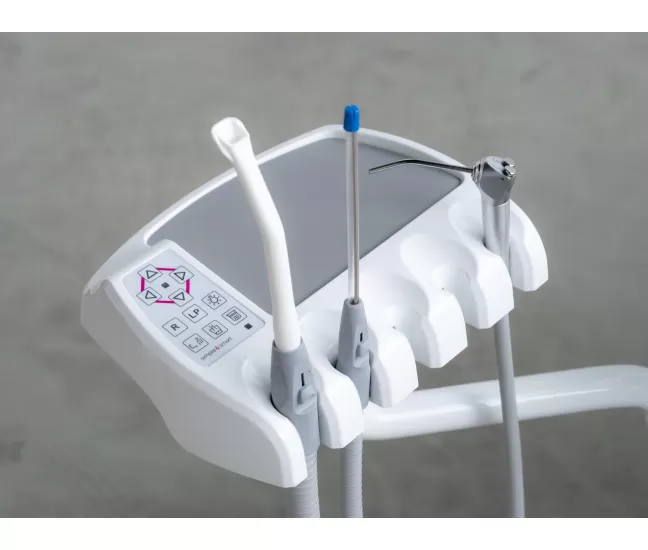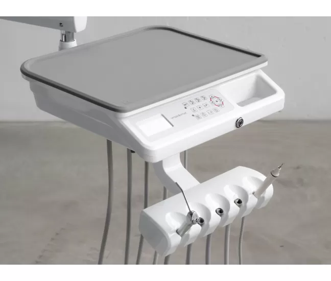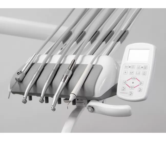 Control panel on instrument tray: 3 programmable positions (trendelemburg position + reset position + last working position). Light control, basin control and programmable glass filling control, water boiler activation, x-ray viewer activation. chair movement controls.