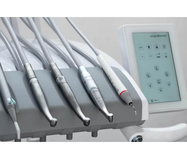 Multifunctional pneumatic pedal: control for instrument activation (even for the electric micromotor), chair movement joystick, water activation switch, basin and glass activation button, chip air button.