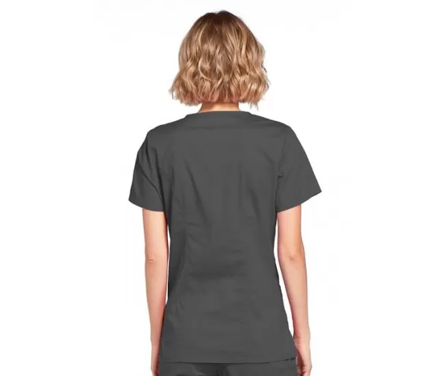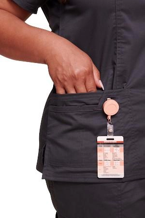 Mock Wrap Top WWE4728 in PewterA Modern Classic fit mock wrap top features front princess seams and double needle top stitch detail. Also included are front patch pockets, a right side pocket with a sectional pocket and I.D. loop, and a left side pocket with an instrument loop holder across pocket. Back princess seams and side vents complete the picture. Center back length: 27.