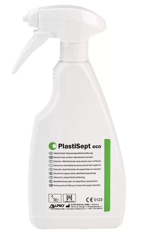 PlastiSept eco, 500 ml.Alcohol-free, aldehyde-free and QAC-free disinfectant ready for use. Especially suitable for alcohol sensitive surfaces of medical devices as treatment units (e. g. upholstery, head rests), suspension tables, in the X-ray area (e. g. chin rests at OPG), surfaces of instruments (e. g. turbines, contra-angles, ultrasonic scalers etc.) and surfaces of acrylic glass (also for solarium beds).