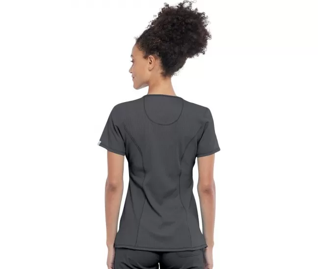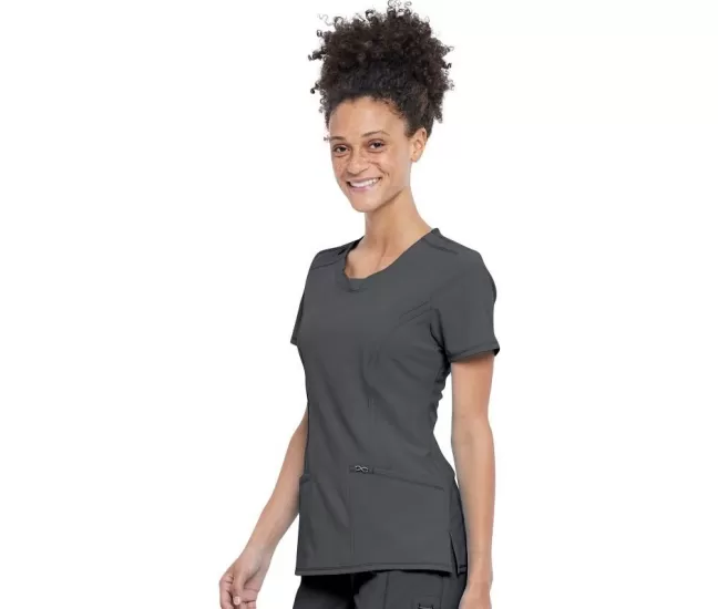 Round Neck Top CKE2624A in PewterA Contemporary fit round neck top with a rib-knit inset at the front neckband also features shoulder yokes, a bungee ID badge loop on the right shoulder, front and back princess seams, two patch pockets, one interior pocket, and side vents.