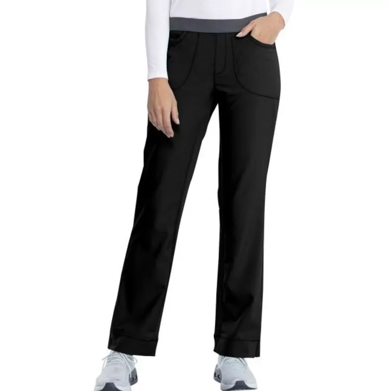 Slim Pull-On Pant CKE1124A in BlackA Contemporary fit, low rise, slim pant features a soft elastic waistband, front curved pockets and a mock fly.