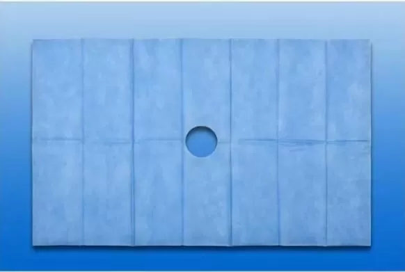 The 2-ply blue drape, 50 cm x 60 cm with 6 cm opening, 1 pcs.The 2-ply blue drape (50 cm x 60 cm cm with 7 cm opening) is individually packed in sterile packaging. It is used for sterile covering of patients and equipment in the OR. The top layer consists of an absorbent polypropylene nonwoven.