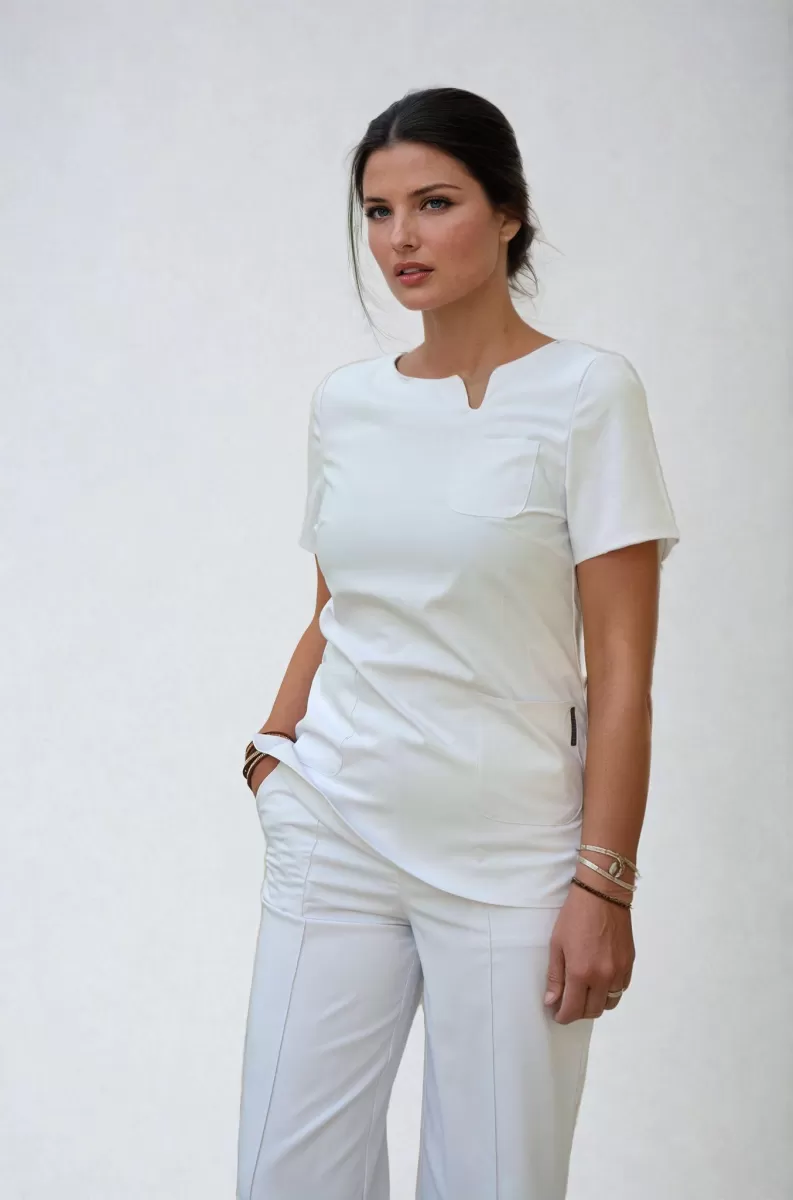 Elegant top with short sleeves.Three convenient pockets: two big pockets on the sides and one small breast pocket suitable for holding pens.
