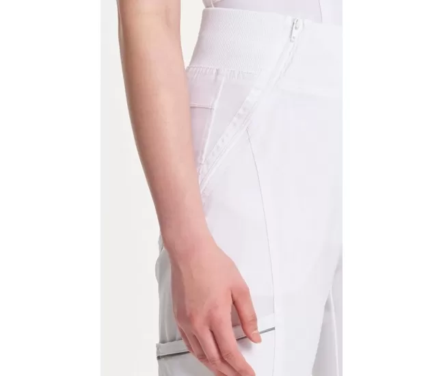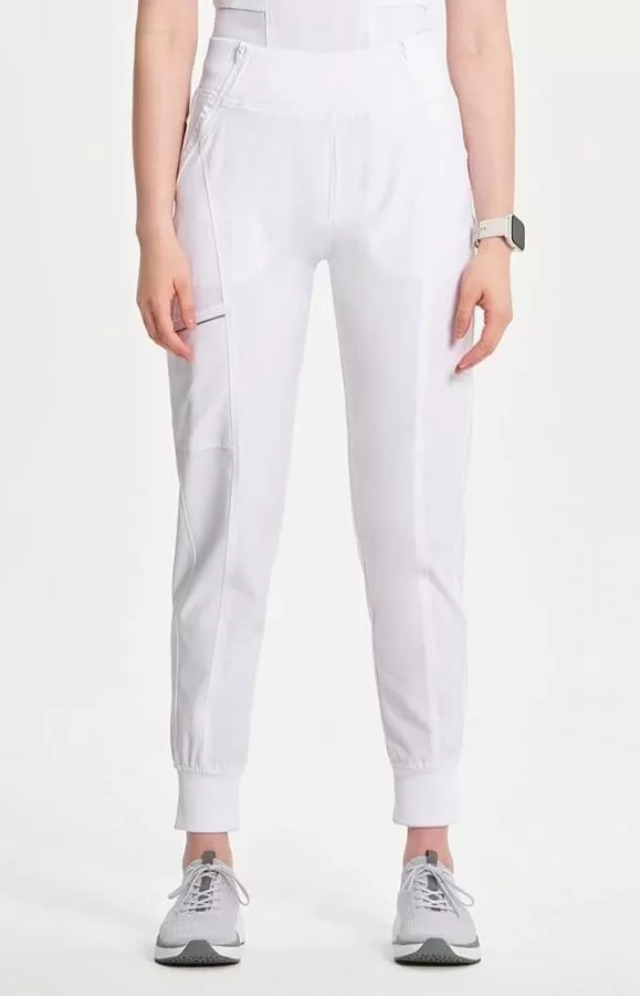 Women's Elastic Waistband Jogger Scrub Pant CK110A WhiteStay ready for anything in the Women's Elastic Waistband Tapered Jogger Scrub Pant from Infinity, built for style, comfort and all-day performance. A soft rib-knit waistband provides a secure fit that moves with you, while front vertical leg seaming and a back yoke create a sleek, athletic silhouette. Five pockets—including two angled zippered front pockets, a right-side cargo pocket with reflective tape and two back patch pockets—keep your essentials close. Rib-knit jogger cuffs offer a sporty finish, and coverstitch detailing throughout adds a polished touch. Designed for pros who never slow down, these joggers blend function and fashion to keep you at the top of your game.