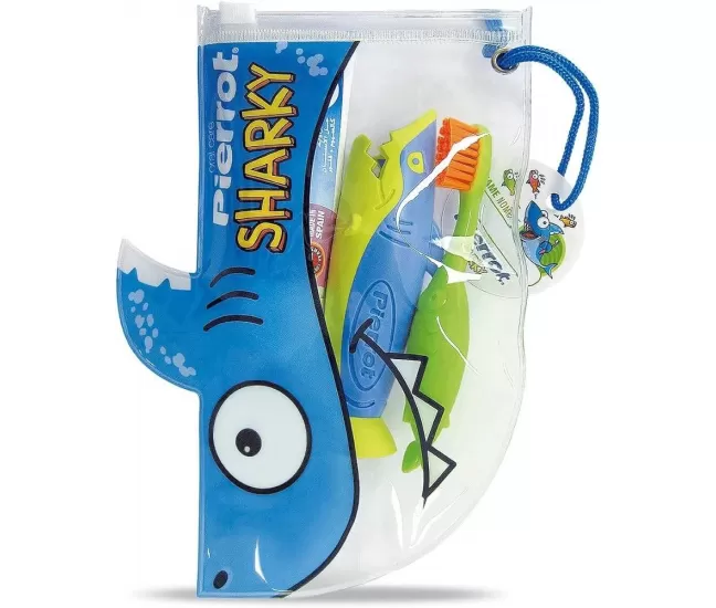 Kelioninis dantų priežiūros rinkinys vaikams SharkyPatogi pakuotė užspaudžiama arba su užtrauktuku.