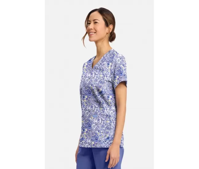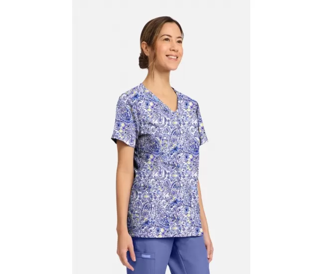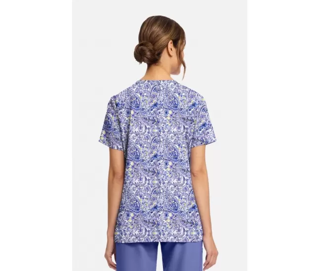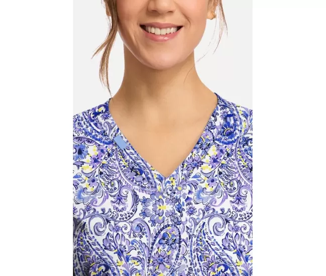 Medicininė moteriška palaidinė CK856 balta su violetiniais gėlių motyvaisDetalės