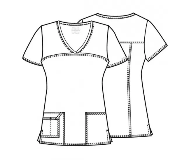 Palaidinė turi V formos iškirptę ir dvi priekines kišenes: vienoje dešinėje pusėje yra kišenė su ID spaustuku, o antroje kairėje - spaustukas medicinos įrankiams.