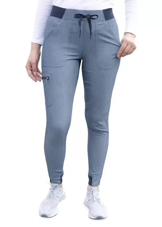 Medicininės kelnės aukštoms P7104 Heather tamsiai mėlynosPlati, elastinga juosmens juosta su raišteliu.