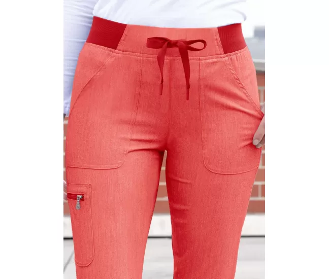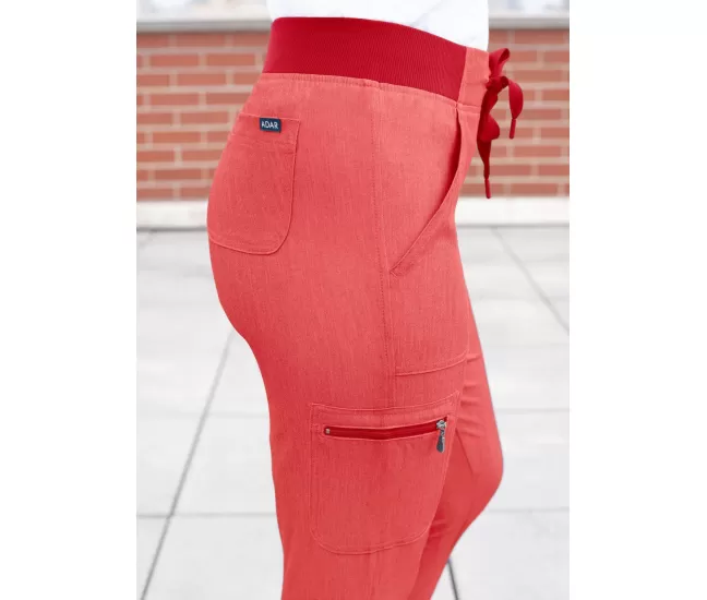 Medicininės kelnės P7104 Heather raudonosPlati, elastinga juosmens juosta su raišteliu.