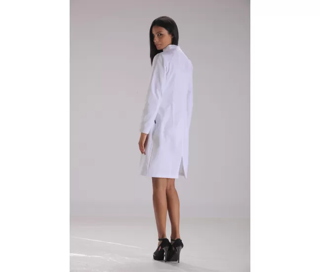 Stilius: elegantiškas, priglundantis chalatas su dviem kišenėmis ir viena rašiklio kišenėle, lengvas, patogus, patvarus.