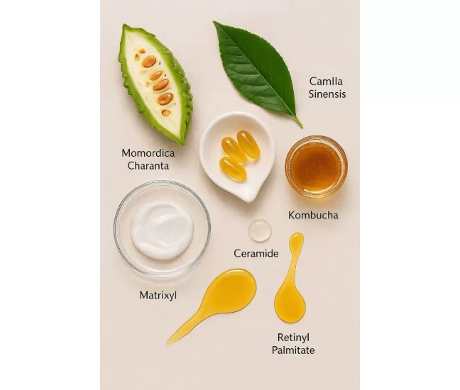 Keramidai atkuria hidrolipidinį barjerą, o kombučia, juodosios arbatos fermentacijos produktas, gerina odos aplink akis kokybę, ją išlygina ir atkuria natūralų švytėjimą.