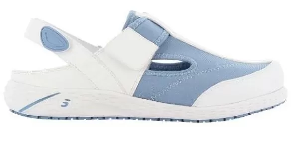 Sintetinės odos medicininės darbinės klumpės ALIZA, balta-mėlynaSintetinės odos klumpės ALIZA baltos spalvos su skirtingo batviršio kelties spalva.