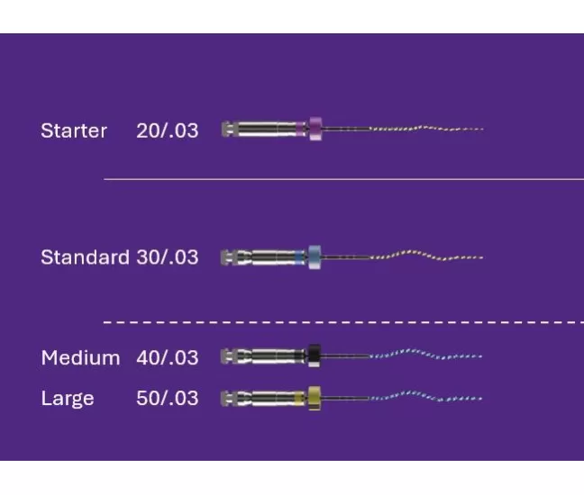 Dydžiai: Starter 20/.03, Standard 30/.03, Medium 40/.03, Large 50/.03.